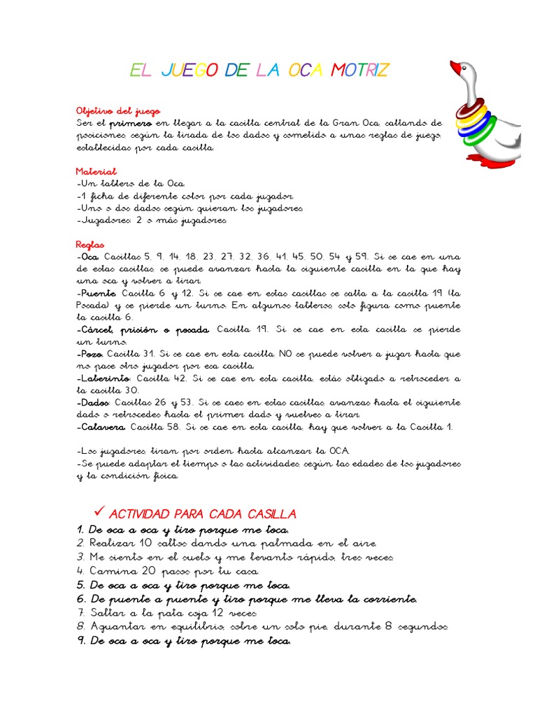 Las reglas del juego de la oca son muy sencillas, se juega con un número mínimo de dos integrantes, uno o dos dados según las preferencias de los estructura e instrucciones de la oca el juego de la oca es muy antiguo, se dice que los griegos lo jugaron para entretenerse durante los largos años en. Las reglas son parecidas a cuando uno cae en una casilla de la oca, lo único que las palabras que se pronuncian son distintas: Check spelling or type a new query. El objetivo es ser el primero en llegar al final del tablero, donde el dibujo es una oca dentro de una estrella, la última casilla. Según la tirada de los dados y sometido a unas reglas de juego, establecidas.